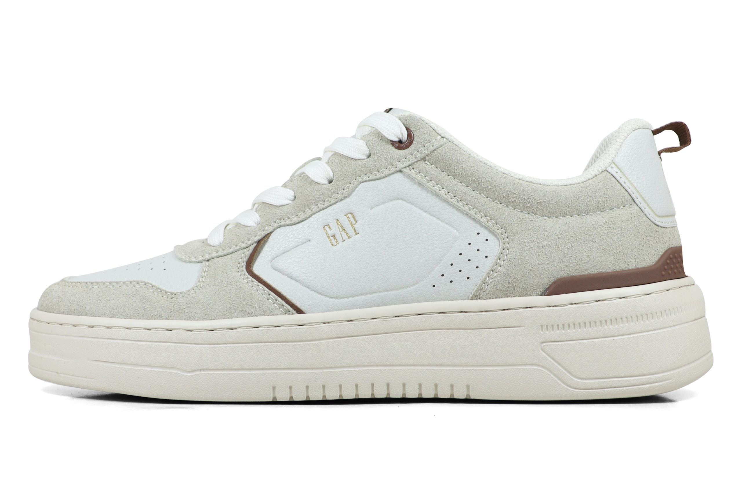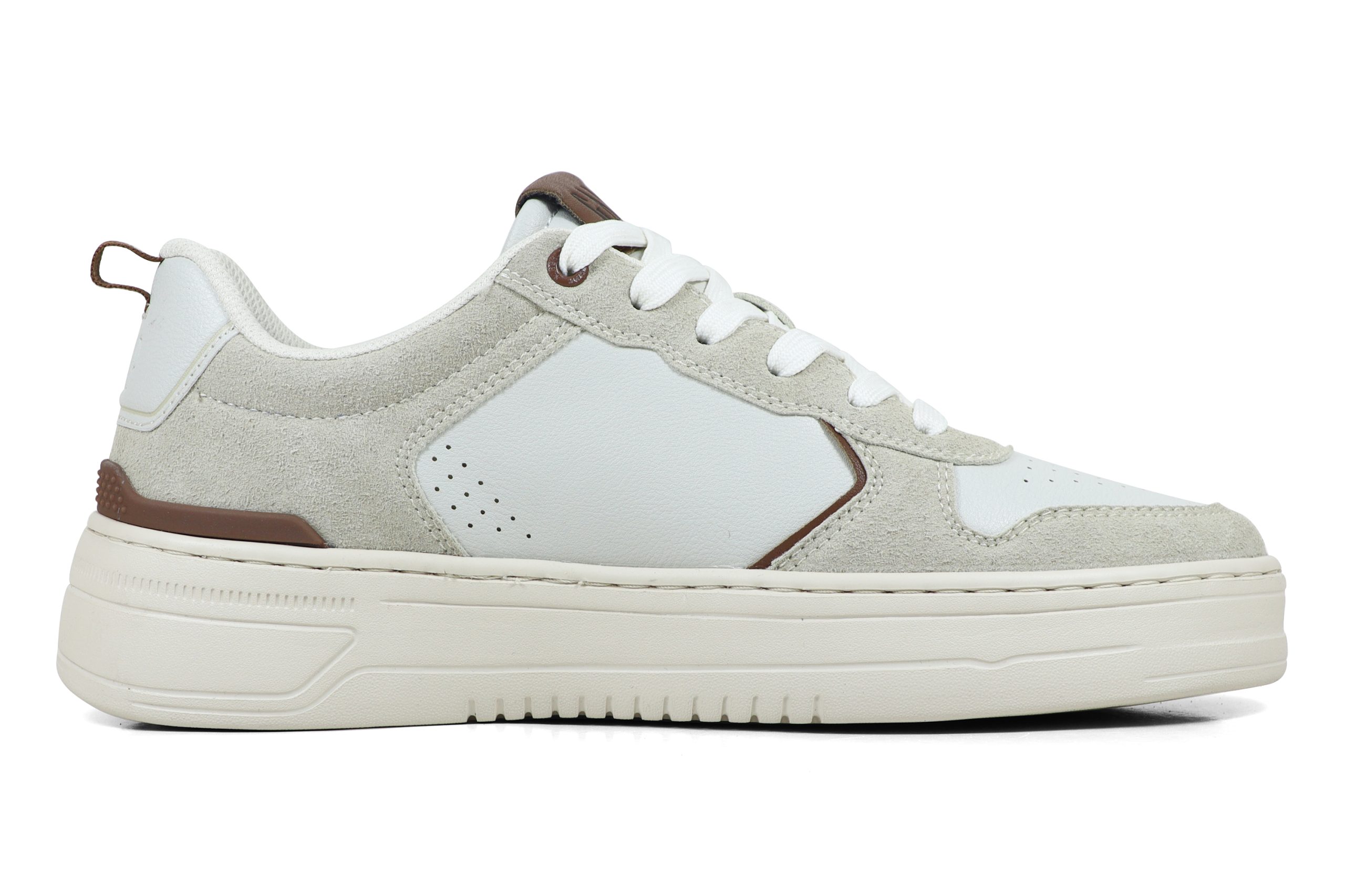 Multi-Layered Upper: Το επάνω μέρος συνδυάζει τεχνικό δέρμα (PU) σε off-white χρώμα με επενδύσεις από σουέτ (suede) σε τόνους της άμμου (sand).