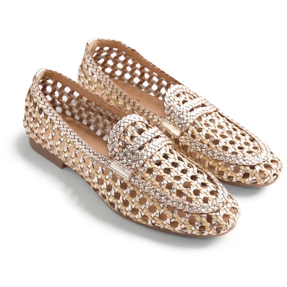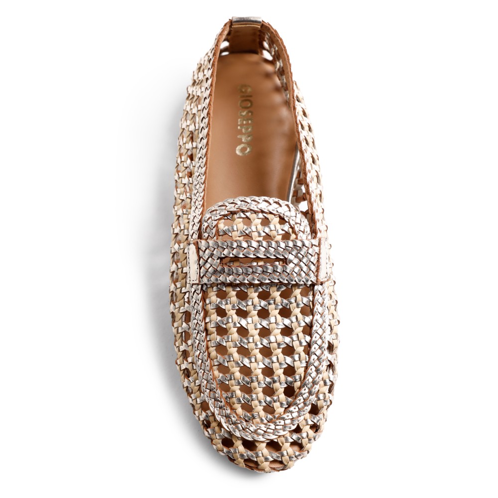 Shimmering Loafer Design: Η κλασική φάσα των μοκασινιών είναι επίσης πλεγμένη με μεταλλικά στοιχεία, ενισχύοντας τον glam χαρακτήρα του μοντέλου.