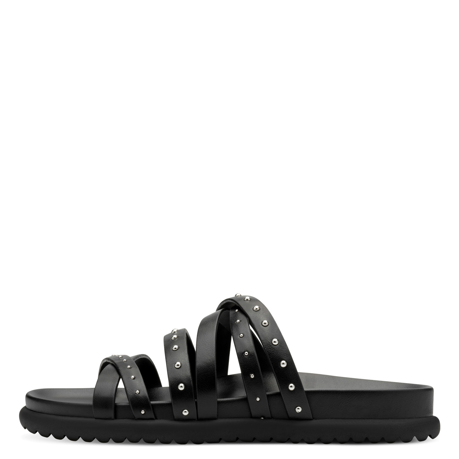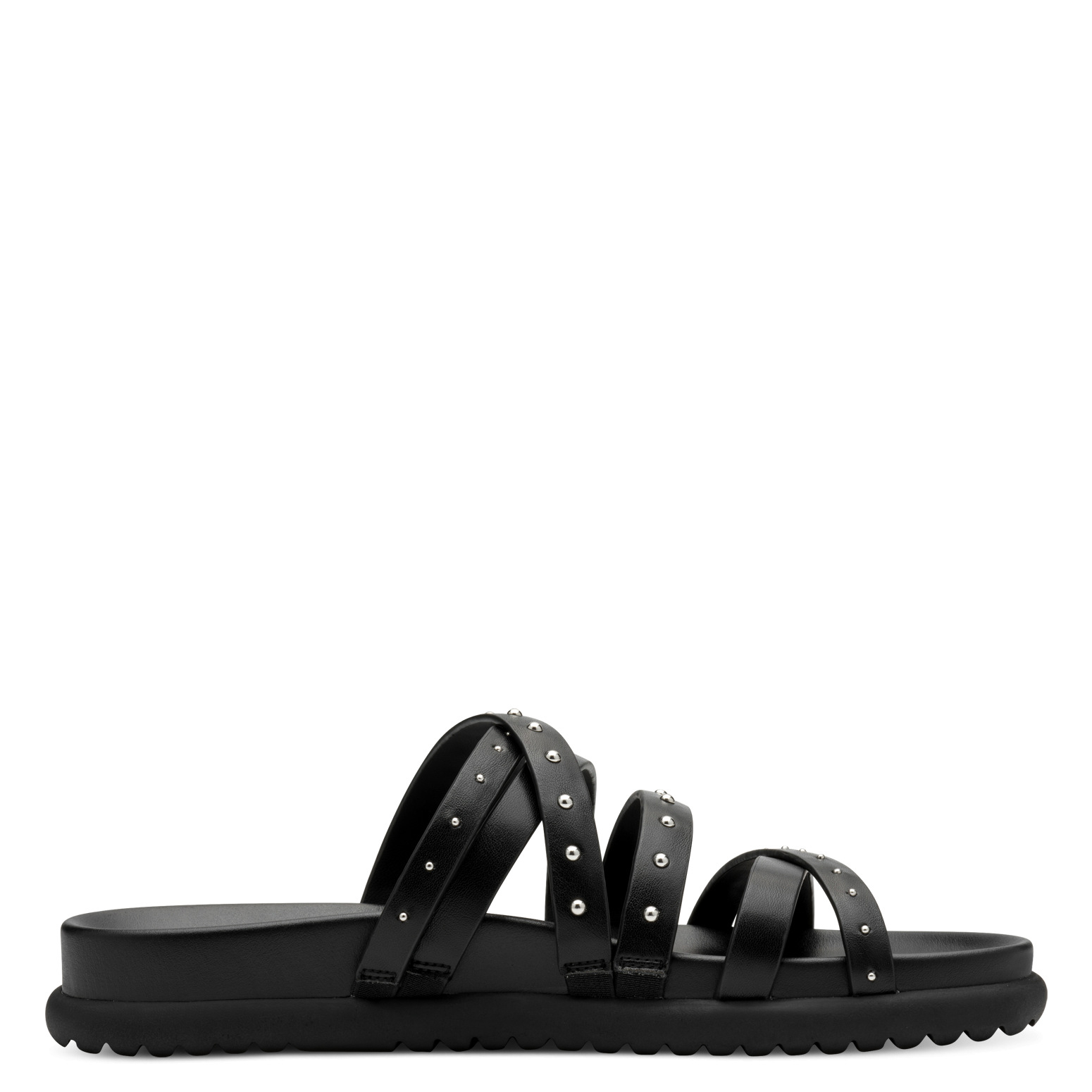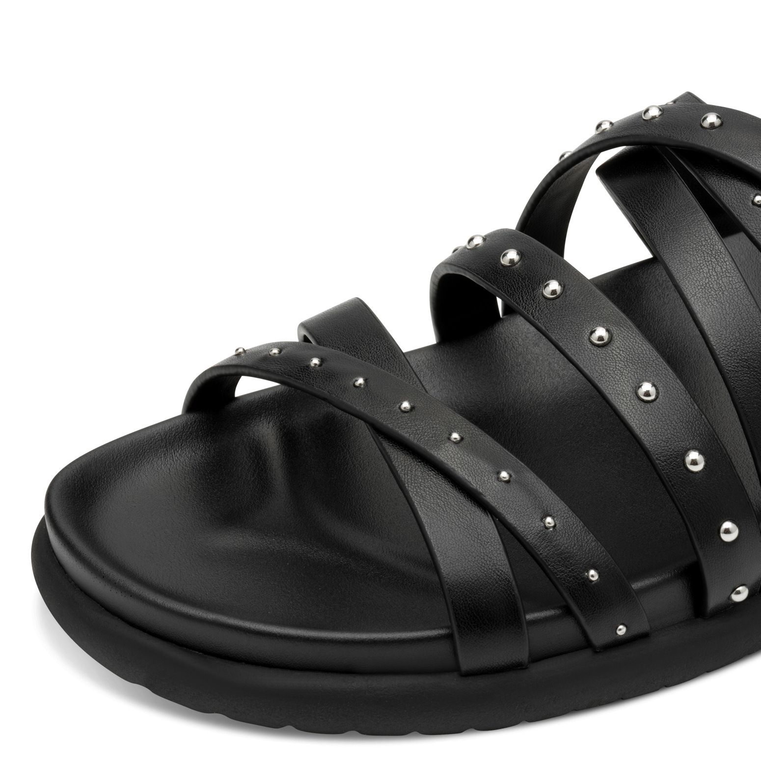 Αυτό το υπόδημα είναι ένα μοντέρνο γυναικείο σανδάλι σε μαύρο χρώμα, σχεδιασμένο με πολλαπλά δερμάτινα λουριά που διασταυρώνονται πάνω από το πέλμα. Τα λουριά είναι διακοσμημένα με μεταλλικά τρουκς, προσδίδοντας μια ροκ και κομψή αισθητική. Η σόλα είναι μαλακή και ελαφρώς ανασηκωμένη στο πίσω μέρος για μεγαλύτερη άνεση, ενώ η κάτω πλευρά της διαθέτει αυλακώσεις για καλύτερη πρόσφυση. Ένα μοντέρνο σανδάλι ιδανικό για καθημερινές casual εμφανίσεις με στυλ.