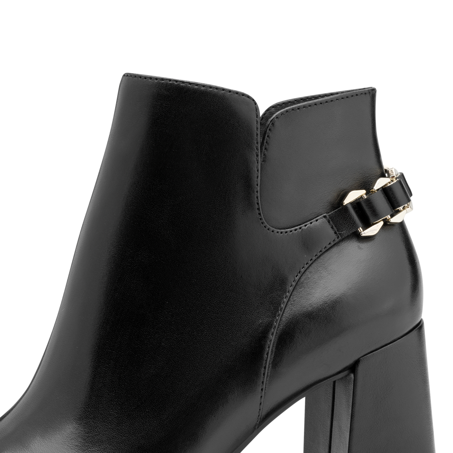 Ένα διαχρονικό σχέδιο που αποπνέει κομψότητα και στυλ. Το γυναικείο μποτάκι σε μαύρο χρώμα, κατασκευασμένο από γνήσιο δέρμα, διαθέτει εντυπωσιακό τετράγωνο τακούνι και διακριτική διακοσμητική αγκράφα στο πλάι, που προσθέτει μια εκλεπτυσμένη λεπτομέρεια στο look σας. Σταθερό, άνετο και εύκολο στη χρήση, χάρη στο πρακτικό φερμουάρ, είναι ιδανικό για ολοήμερες εμφανίσεις.